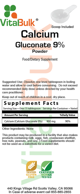 Description Calcium Gluconate 9% - Active Ingredients: Calcium (as Calcium Gluconate 9%) 450mg. Other Ingredients: None